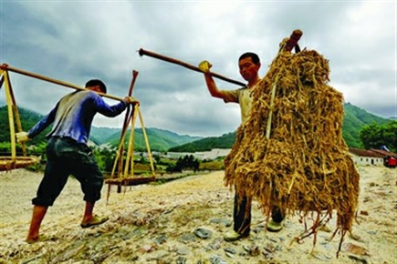 宣纸生产周期长且制作繁琐。檀皮和稻草要用山泉水浸泡,经浸渍、蒸煮、拣选、摊晒,加上日晒雨淋露炼漂白等自然加工,使每根青檀皮、每根稻草都洁白如棉、柔而有韧,原料制作方告结束,仅此一项就需要8至10个月。图为工人在摊晒草料的情景。