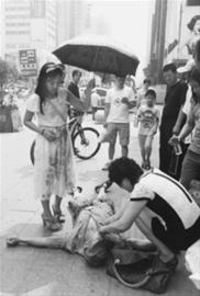 七旬老人当街晕倒,你敢不敢救? 7月27日中午,在沈阳市皇姑区闹市,一位七旬老人晕倒在人行道上,围观者众,却没有人上前施救。这时一位中年女子走上前来,俯身问明老人是心脏病发作,把包往地上一扔,翻出一粒“救心丹”,塞进老人嘴里。一会儿工夫,老人渐渐清醒,并坐了起来,连连作揖表示感谢。见老人确实脱离了危险,救人者才转身离开。