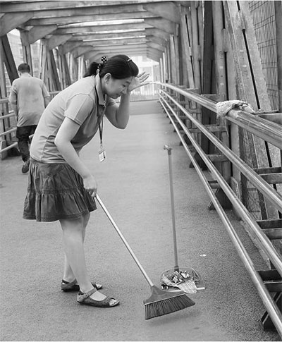 志愿者在打扫“扫桥爷爷”打扫过的过街天桥。肖 潇摄