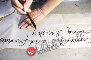 退休后,夏爷爷喜欢练毛笔字,有时也用毛笔书写英文。