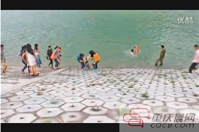 很快,一个穿绿背心的男童被救上来了,听周围的群众喊:“水里还有一个”,白衣青年转身又跳进江中,将穿红背心的女童也救了上来。