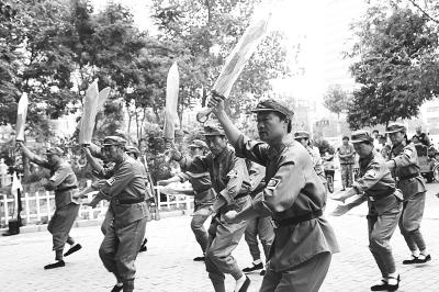 老人们在排练“大刀向鬼子们的头上砍去”的场景。