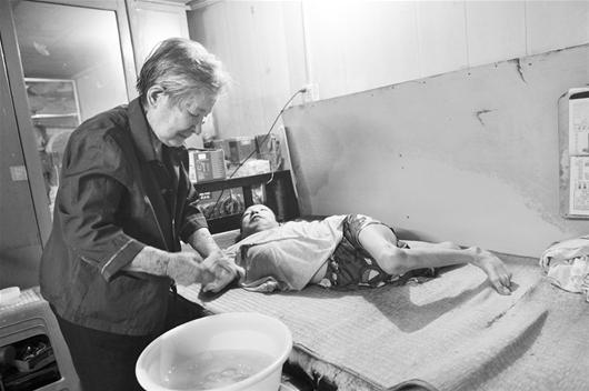 昨晚8时许,汉口吉庆街头华灯初上,很是热闹。街边一处30平方米的阁楼里却显得有些冷清,在昏黄的灯光下,92岁的唐春华拿来水盆兑好温水,拄着拐杖慢步走向床头,拧干毛巾开始擦拭着小儿子董长伟的身体。