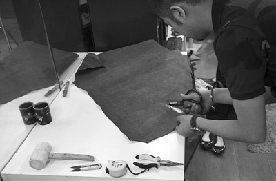 设计师金震宇在工作台上裁剪皮料