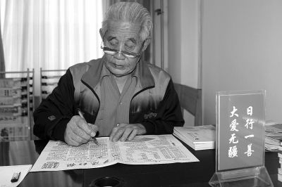 姚铭老人正在校对新一期的《夕阳红报》。