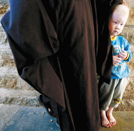 这名患白化病的孩子,在法师宽大的袈裟下,宁静而安详。
