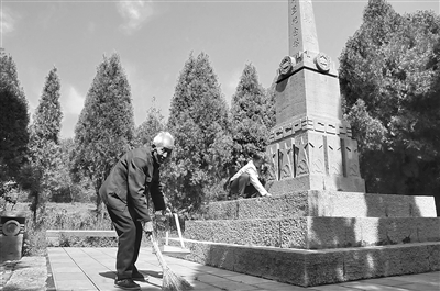 杨爱公和大儿媳妇李秀英在清扫左权将军墓。 张斐摄