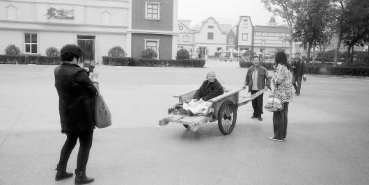 4日,张金宝用平板车载着母亲在齐河欧乐堡游玩,引起不少游客关注,一些人上前称赞、拍照。本报记者 乔显佳 通讯员 姜山 摄影报道