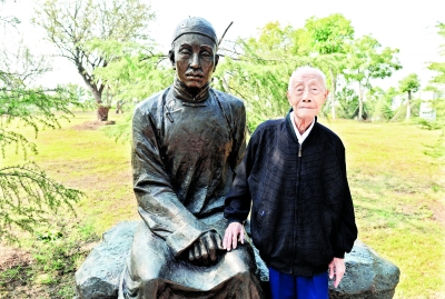 任桐长孙任世铎和祖父雕像合影 记者周超 摄