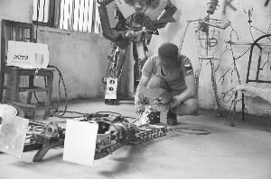 4年前,一次偶然的机会看到一辆父亲报废了的三轮电动车,黎方楷有了动手改造的念头,当时家人表示要以1000元的价格当废铁卖掉,他却坚持花了一周时间把报废的三轮车做成了一把个性十足的椅子。“我自己觉得很漂亮,后来又用废旧金属给我孩子做了一对动画片里的大头儿子和小头爸爸,给自己做了一支金属乐队。”黎方楷说,自己从事的是电焊工作,有一定的机械加工基础,所以这些东西摆弄起来比较顺手,做了几个模型之后他发现自己越来越喜欢,于是每天一下班,他都会一头扎进自己的小工作间,敲敲打打忙到半夜。在四年时间,他做了20多件作品,变形金刚、圣斗士星矢、猪八戒、迈克尔·杰克逊……小的只有几十厘米,大的足有近两米高,件件作品栩栩如生。
