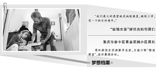 9月21日,重庆市渝中区大黄路喜业花园的8岁“玻璃女孩”郝悦含从医院输完血小板,邻居们高兴地把她接回了家,看到小悦含精神状态不错,小区小卖部老板曾国强又召集“语文老师”谭国华、“数学老师”张龙祥来到“楼道课堂”为郝悦含上课。