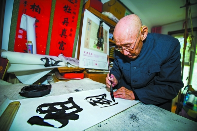 ◀ 书法是窦老爷子老来的爱好,每逢国庆,他都会用书法来表达自己对祖国的热爱,今年的国庆,他又写下一幅“祖国万岁”祝福祖国。