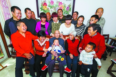 ▶ 窦家如今已是四世同堂,四个女儿都没有远嫁,一家人经常能凑到一起。今年重阳节拍全家福的时候,四个女儿不约而同地穿上了红色的衣服,围坐在窦老爷子身边,一家人尽享团圆。