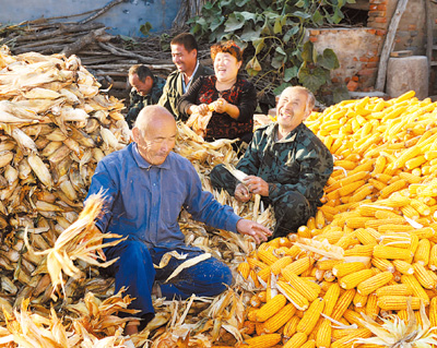 10月14日,赵灿(右二)和四个伯伯叔叔一起收玉米。