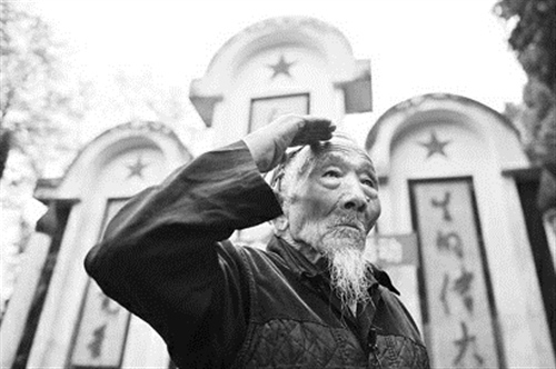 昨天,刘福昌老人在红军烈士墓碑前敬礼。 新华社发