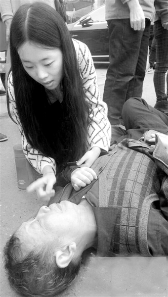 12时3分许,当所有路人都一筹莫展时,一位20岁左右的女孩扒开人群来到老人面前,弯下腰对老人进行初步检查,并一直询问老人:“爷爷,哪里痛?可以说话不?脑壳痛不痛?这里痛不?”谈话间,她不时掐着老人的人中。众人得知,这名女孩是一名护士,但没说自己是哪家医院的。