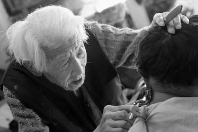 2012年2月23日,农历二月初二“龙抬头”,时年99岁高龄的靖奎老人在家为一位慕名而来的顾客剃头。 本报记者 方非摄 (资料照片)