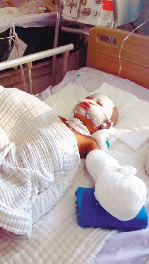 7日,记者透过医院重症监护室玻璃窗看到,悦悦浑身缠满纱布,脸部、四肢也蒙着纱布。护士告诉记者:“孩子太可怜了。气管切开后,不能哭、不能说话、不能吃饭,只能靠眼神‘说话’,大人猜她想干啥。现在,打营养只能靠鼻饲管。”
