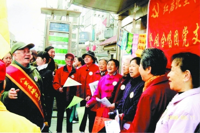 您别说,这一唱,还真有效果。在红庙路口的公交站台,引导员李丽环引导大家自觉排队,不时会遇到不讲理、着急的乘客,有时候还出言不逊,好说歹说才能回到队尾去。敖老爷子带着合唱队的人配合引导员一唱“排队歌”,近几个月来再没碰到犯横的。老爷子还带着志愿者,在朝阳路的八里庄段各个路口传唱,劝阻行人不闯红灯,“一天下来得劝阻上万人。”老爷子一脸自豪。