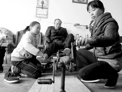岳西县天堂镇木冲村村民汪凤明,原本家庭生活十分幸福。一次意外车祸,彻底打破了她家的平静。她的丈夫因此次车祸致瘫,生活完全不能自理,吃饭、穿衣、大小便等都要人服侍。汪凤明每天白天除了服侍瘫痪的丈夫、照顾幼小的孩子,接送大孩子上学、放学,还要不定时帮助丈夫康复锻炼。为了维持生计,她晚上把丈夫和两个孩子安顿在床上睡觉后,再给服装厂加工服装到深夜……汪凤明说:“虽然丈夫瘫痪,但只要他在,这个家就是完整的。”日前,汪凤明家被当地评为“四星级文明户”。图为11月17日汪凤明(右)用康复器材,帮助丈夫储先记康复锻炼。 本报通讯员 吴均奇 摄影报道