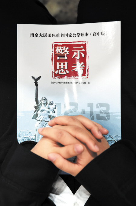 12月1日,南京金陵中学一名学生在首发式上领到了《南京大屠杀死难者国家公祭读本》(高中版)赠书。