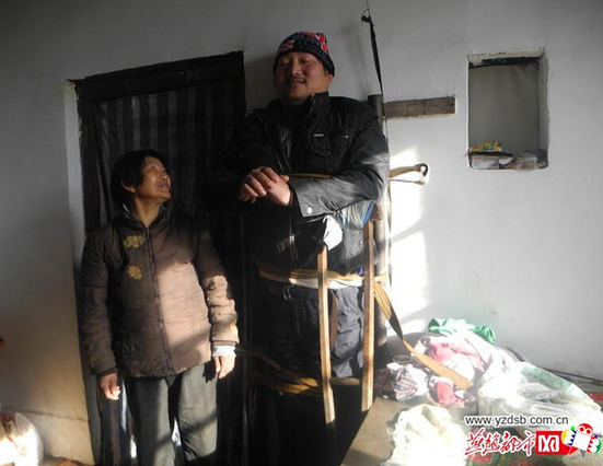 2012年,敬伟从电视中看到一款高科技的轮椅,该轮椅可以通过座位的升降,让病人慢慢站起来。“我也想通过外界的辅助,体会一下站起来的感觉。”于是他让母亲找来两根胳膊粗的铁棍固定在墙上。就这样借助两根铁棍的支撑,他被绑到了墙上。