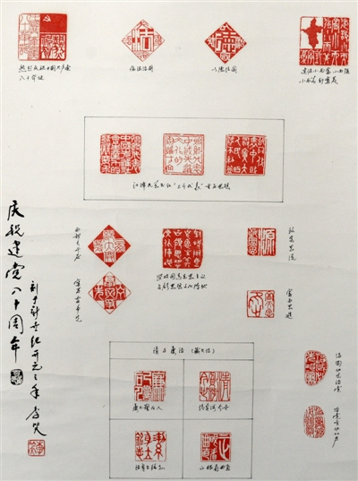 为时代和宁夏鼓与呼,一直是李笑篆刻艺术的主调。如《西部大开发》《宁夏要争先》《建设大银川》等印章,就是宁夏人民奋发有为、昂扬拼搏的视觉印痕,令人印象深刻。老人近期又拿起铁笔篆刻了一系列有关“中国梦”“依法治国”等内容的印章。