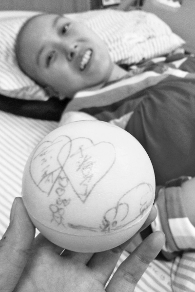 会香的手上有一个用于锻炼胳膊的小球。小球上,是海宁和会香一起画的一幅画。画面上,两颗心紧紧相连,下面有两个小人儿,手牵着手,旁边还有一只可爱的老鼠。会香说,两个小人代表了她和海宁,本来想在旁边画只小狗,但海宁不会画,于是就笨手笨脚地画了只老鼠。