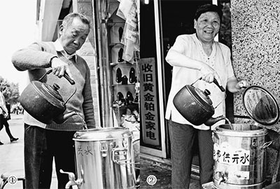 水烧开了,厨房里传来水壶欢快的口哨。王彩仙(见图②,本报记者张文摄)用毛巾小心地裹着壶把,拎着水壶来到离家不远的三岔口西路,把开水倒入放置在路口的“爱心保温桶”中。