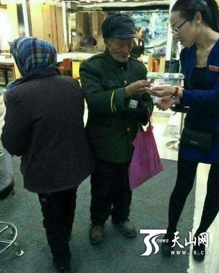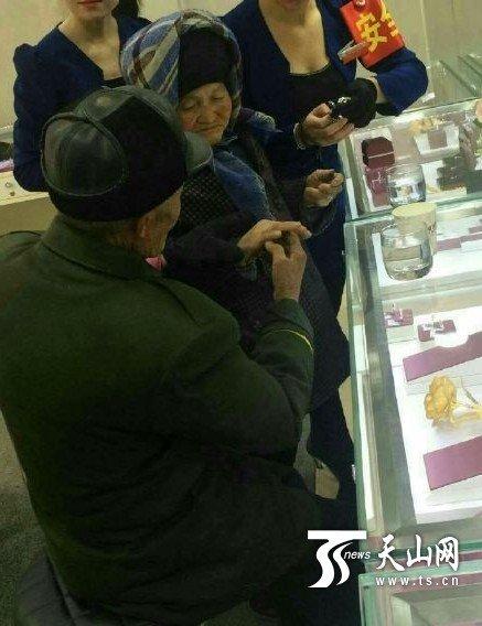 拾荒老人将钻戒戴在老伴儿的手指上。