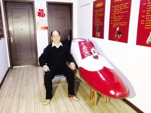 昨天,记者在余大爷的家中见到了他制作的巨鞋。巨鞋表面用红皮和白皮包裹,是一只放大版的香槟鞋。余大爷现场用皮尺丈量,鞋子长2.2米,高0.9米,宽0.8米,按照国内鞋码计算这只皮鞋超过了400码。