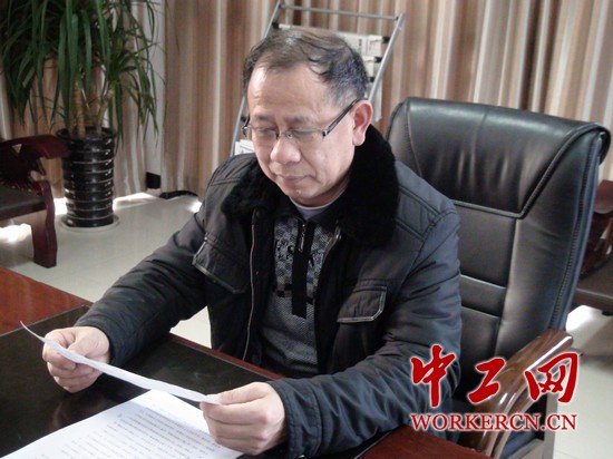 图为伤残军人王明新在安乡县总工会办公室在阅读2002年4月5日三湘都市报的文章并讲述当年的事情。