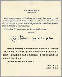 印有白宫标志的贺卡上,贝克尔·奥巴马及夫人米歇尔·奥巴马的亲笔签名十分醒目。“我谨代表我和我的家人在你们结婚60周年纪念日之际,向你们表示衷心的祝贺,你们结婚60周年的同甘共苦和风雨同舟是我们所有人的榜样,我们深深被你们真挚的情感所感动。你们60周年的相濡以沫是我们共同的宝贵财富!衷心祝福你们钻石婚纪念日快乐!”