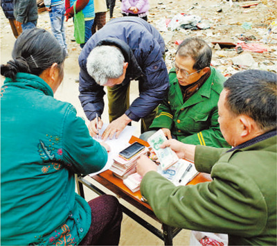 邓双生(右二)替去世的老伴为工友们发工钱。孙永军摄(人民视觉)