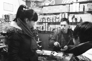 1月23日上午,三名顾客走进小店,围在柜台前选购手机电池、充电器。柜台内,一位眼睛略带残疾的女子,耐心地给顾客讲解着产品的特点和性能。而柜台里的男子却一直埋头修理着一部手机。他们俩就是小店的老板张新建和妻子宋丽莉。