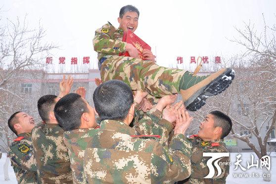 自治区道德模范、武警喀什地区支队五大队莎车县中队二班班长闫大鹏收到礼盒后,被战友们高高抛起。