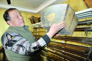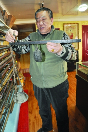 王殿和收藏的最长的秤杆是2.8米,最喜欢的是一个雕刻精美图案的红木秤杆,最贵的是花1.5万元淘回来的民国时期1.5米长的大秤杆。有意思的是还发现了一个黑心砣,铁权底部暗镶着一大块铅。