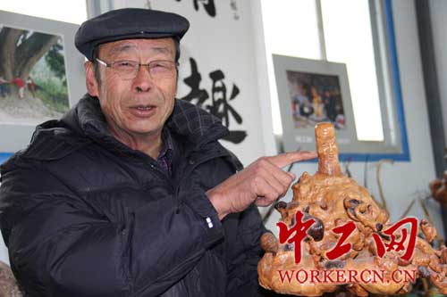 甘肃省崇信县根雕艺人朱继国和他的作品《贵人》