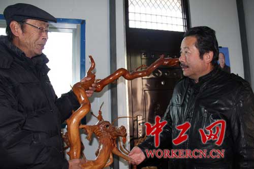 朱继国和平凉市民间文艺家协会副主席何文华交流介绍根雕作品《中国龙》