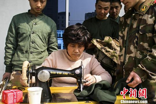 2012年3月1日,韩阿姨为刚分配到武警宁波支队一大队四中队的新兵缝补衣服。 殷福军 摄