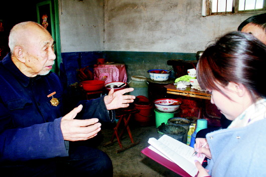 乔天华的儿子乔洪珍(左)向记者讲述父亲当年的抗日事迹。(摄影/孙京信)