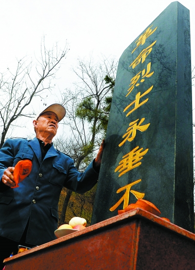 重新修建后的墓地整洁、肃穆。原来的土坡修成了水泥路面,还砌上了台阶和栏杆,墓地四周也用石头和水泥砌起了半米高的围墙,高耸的墓碑上刻着“革命烈士永垂不朽”几个苍劲有力的大字,墓碑两侧挺立着两棵青松。大家挥动铁锹给烈士墓培上新土,老宋在墓碑前摆上水果、点心,满满倒上四杯白酒,祭奠逝去的先烈。师生们也为烈士敬献上花圈和花篮。