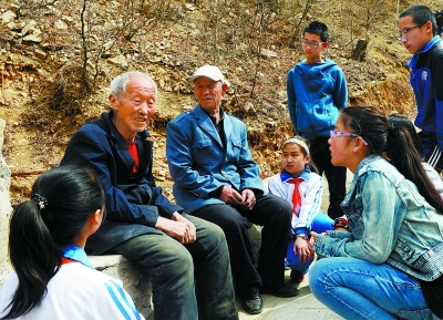 延庆二小的学生和“慈孝五少年”围在张书才和宋金海身边,认真地听他们讲述烈士墓的来历。