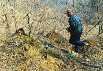 宋金海带着准备好的祭品来到革命烈士墓,村里的党员也带着铁锹一同来扫墓。