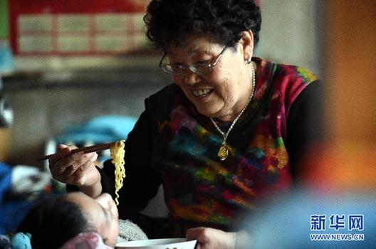 4月17日,杜秀荣在给养女喂面条。新华社记者李晓果摄