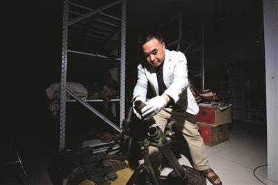 段生馗摸黑带记者到滇西抗战纪念馆负一楼的仓库,介绍他收藏的十多万件文物。