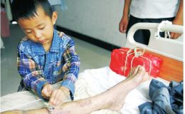 从车祸发生至今近一年的时间里,李宇佳像个“小大人”一样,给爸爸洗腿、按摩、擦拭伤口、打饭、端屎端尿,成为父亲身边随叫随到的守护者。(李剑力/文王永芬/图)