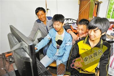 昨日,董永强(左)特意为三个孩子购置了电脑,供他们学习使用。 重庆晨报记者 甘侠义 摄