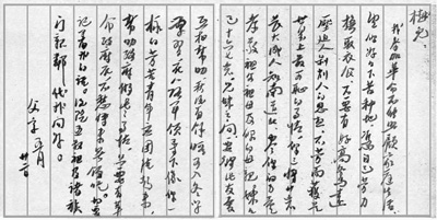 “我父名重泰,字春和,祖籍河北青县,家贫,幼失父母,随长兄在农村出卖劳力为生。为谋生,应募当兵,参加甲午中日朝鲜战争,平壤战败,全军溃散。目睹封建专制下的统兵将帅,腐朽无能,失地辱国,涂炭生灵,满腔义愤,无能为力,只得返回不愿回的家乡,再过挑脚贩盐与人雇工的艰苦生活……国民革命军北伐,他表示同情,热烈拥护,并促使我参加进去尽一份力量。从此,对我的一切革命活动,尤其密去延安的行动,他满心喜悦而又大义凛然,对我进行忠孝不能两全的教育。每一想起当时情景,不觉眼湿心酸。”