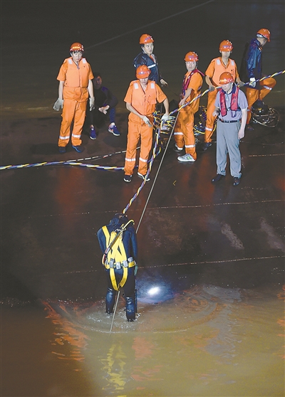 6月2日,救援人员在夜幕下对“东方之星”轮展开营救。新华社发
